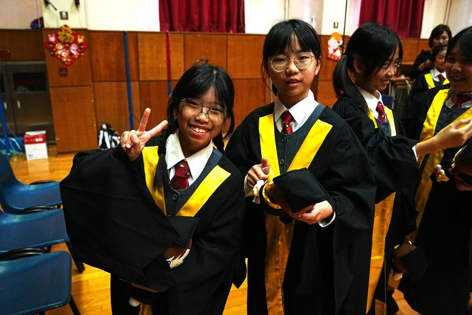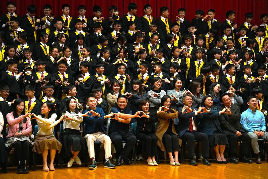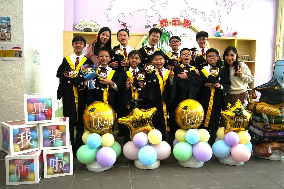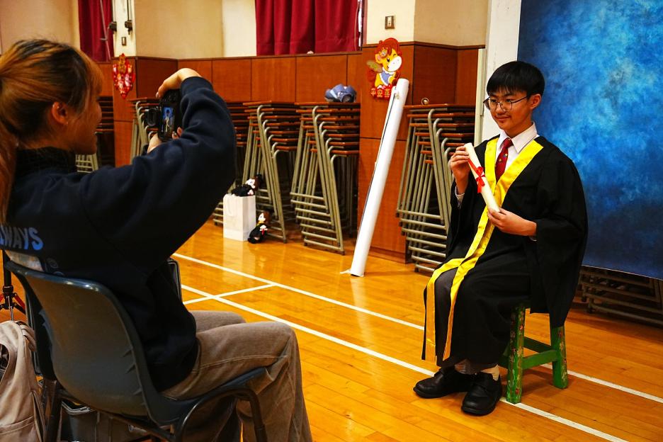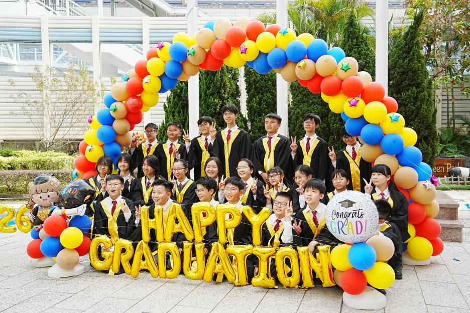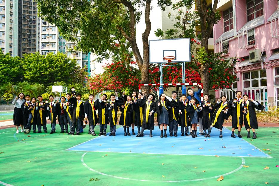 2月11日,陽光明媚,六年級同學穿上畢業袍,在校園各個角落與老師拍照留念,笑臉滿載、氣氛熱烈。 校長老師更成為「人氣王」,同學與家長們紛紛排隊合照!