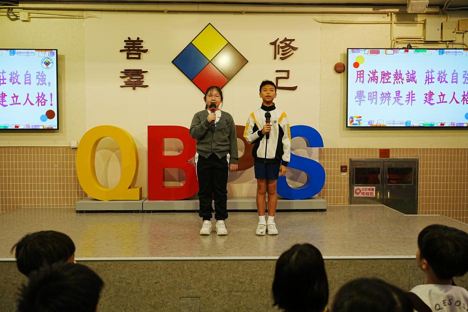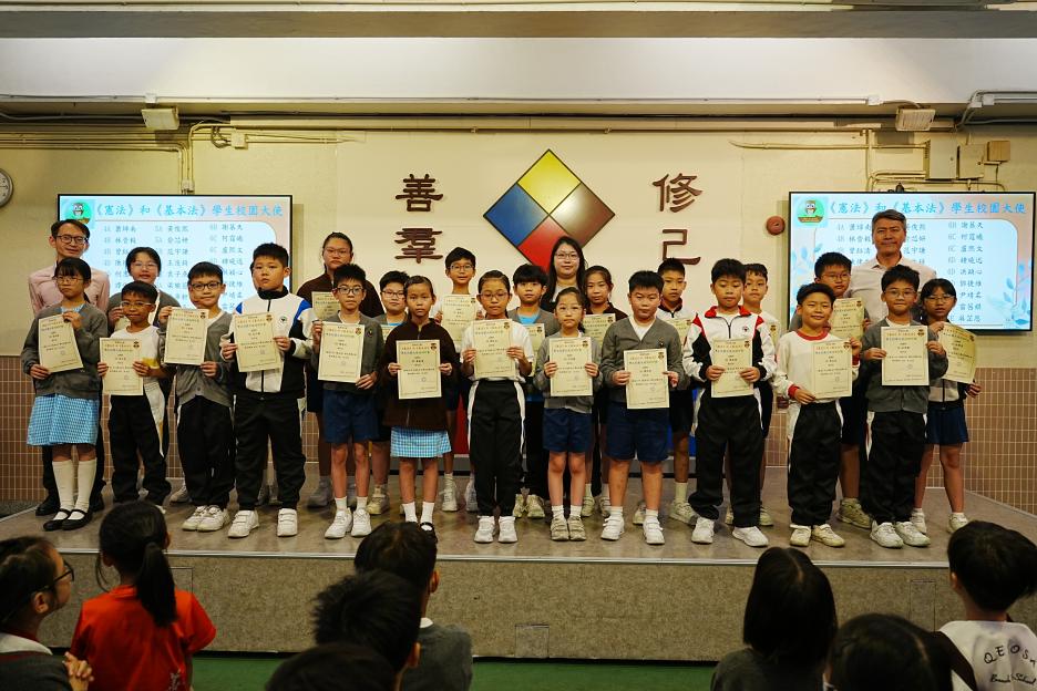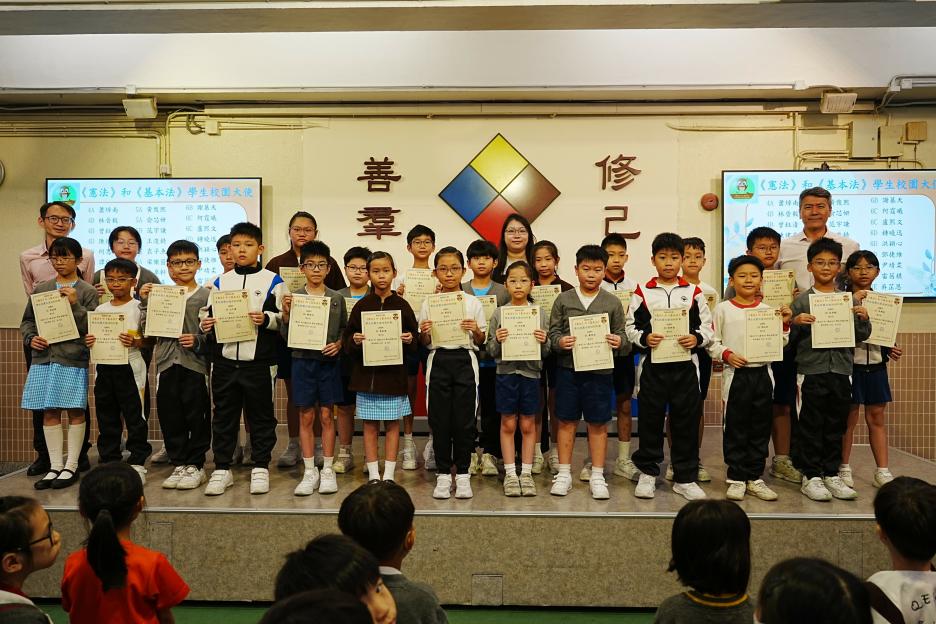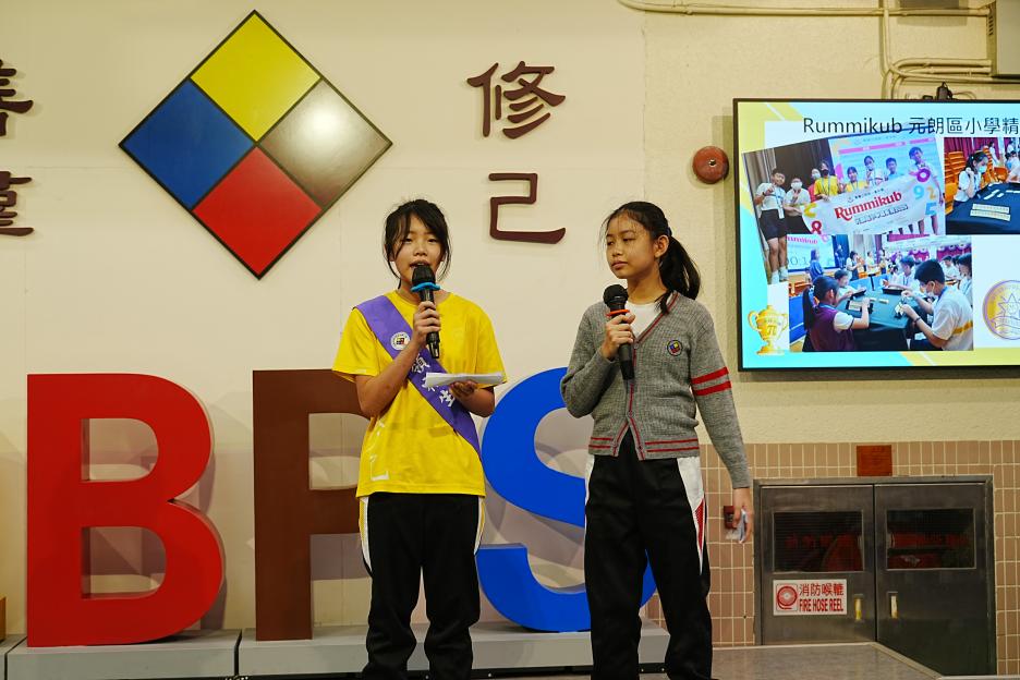 今天是普通話早會,首先頒發憲法和基本法學生校園大使計劃委任狀。然後是「Rummikub 元朗區小學精英賽 2025」的頒獎。最後是領袖生、便服日和伊Class計劃的宣傳。